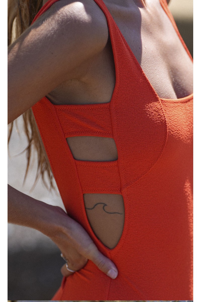 Bañador tejido textura color naranja con escote cuadrado y aberturas laterales.