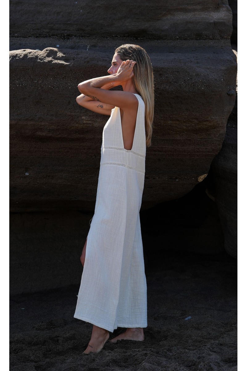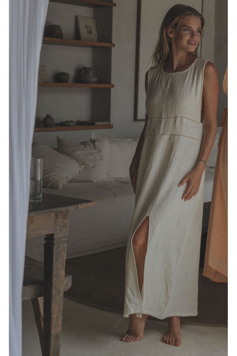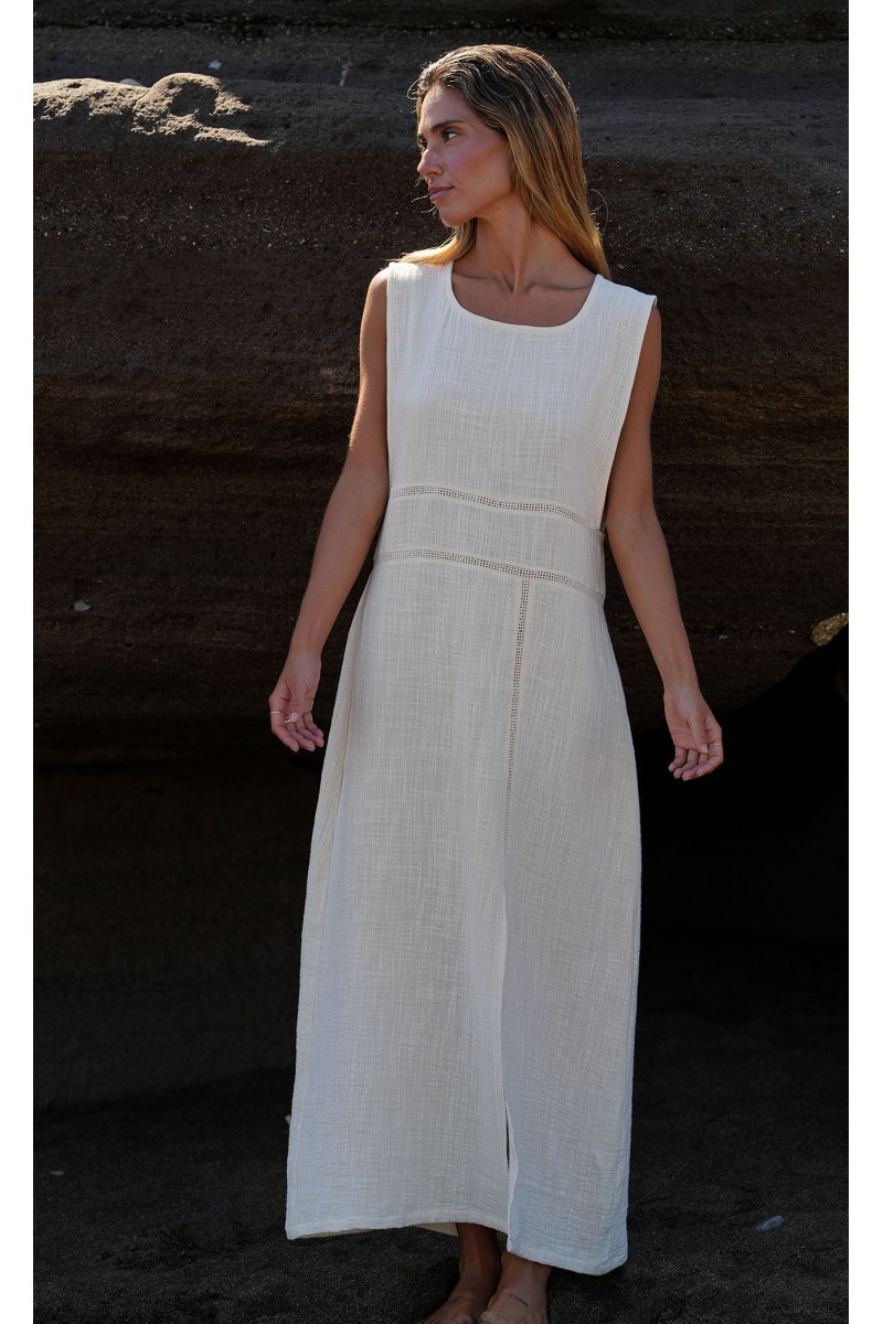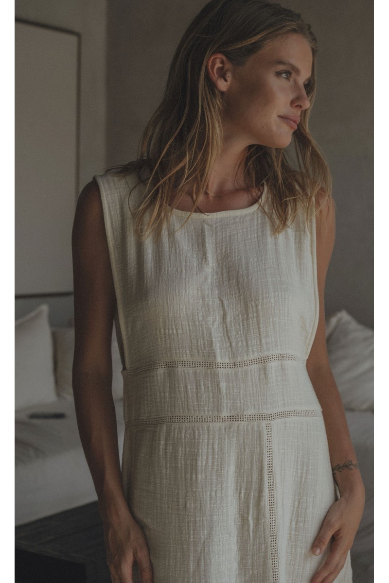 Vestido en tejido algodón rústico orgánico en tono crudo.