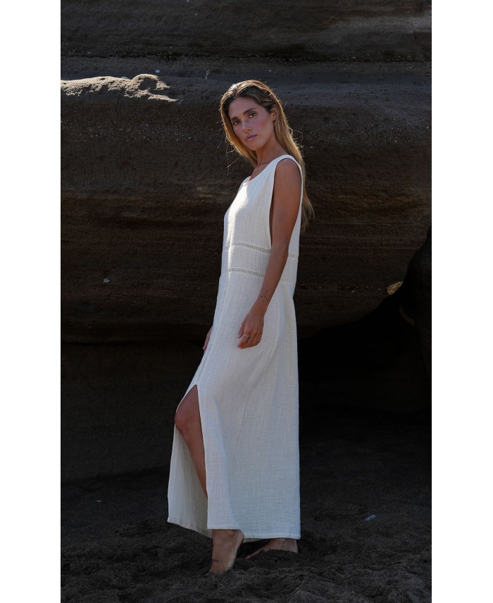 De inspiración griega, este vestido de aire fluido lleva puntilla en la zona de la cintura estilizando la figura y aportándole un toque delicado y femenino. En la zona de la cadera, lleva una cremallera para facilitar su puesta.