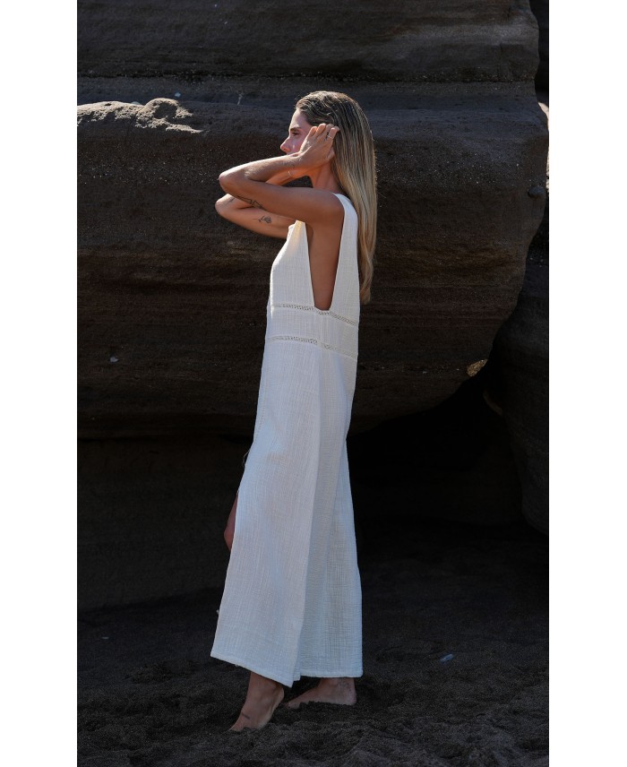 Peto en tejido algodón orgánico rústico en tono crudo. Los tirantes se anudan a tu gusto y medida y el escote de la espalda se puede llevar desnudo o con una tira central que se puede anudar en forma de lazada para una mejor sujeción. El pantalón con bolsillos, va pinzado en el frente y lleva cintura lo que aporta un aire más sofisticado. Se abrocha...