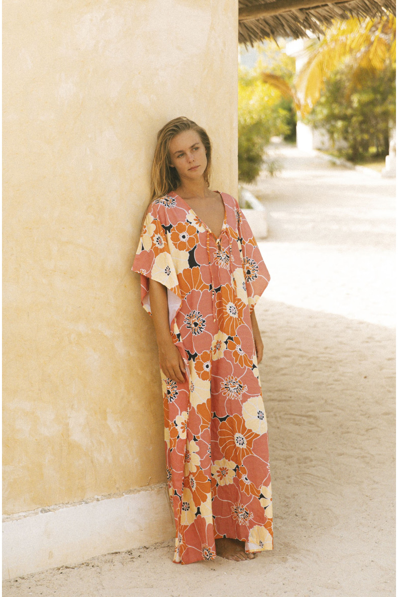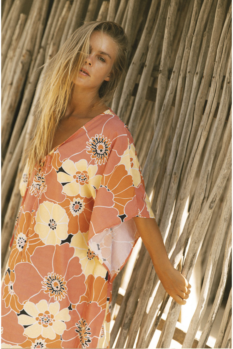 Kaftan de talla única en tejido 100% algodón con estampado en exclusiva de tacto suave y fluido.