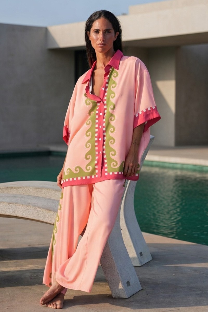 La camisa cortada en redondo en la parte trasera aporta fluidez y ligereza. El estampado diseñado en exclusiva combina colores muy favorecedoras en un tejido fluido con mucho movimiento que podrás combinar con el pantalón a juego creando un total look ideal.