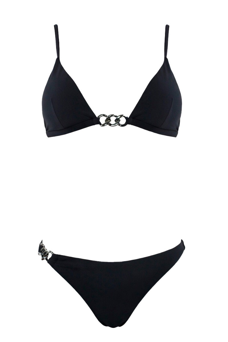 Bikini negro de tejido italiano suave. Escote en forma de triangulo con tirante regulable y detalle de cadena en el escote.