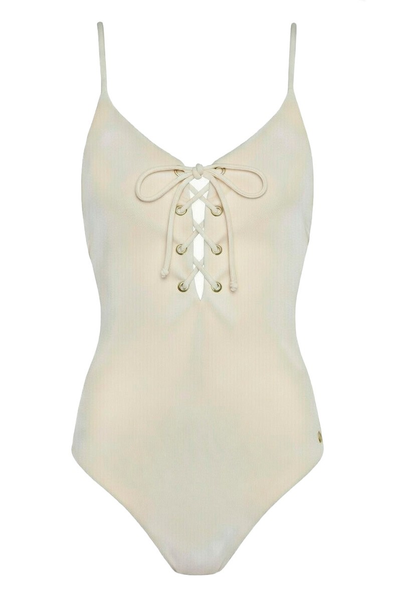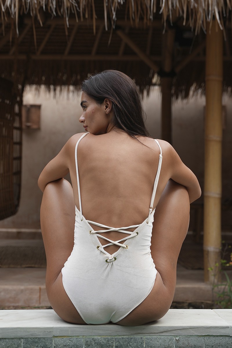 Bañador icónico de WILD & SALTY se presenta esta temporada tejido de terciopelo crudo italiano de secado rápido con abertura regulable en el pecho y en la espalda.